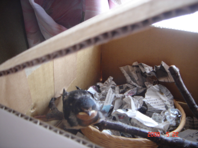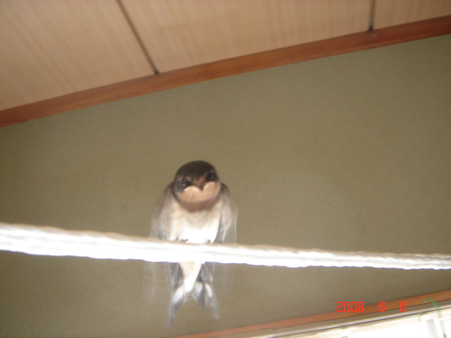 ↓保護して二週間目のツバメ。デジカメもケイタイも嫌いらしく、写真を撮ろうとすると逃げるので、きれいに写真が撮れません(笑)